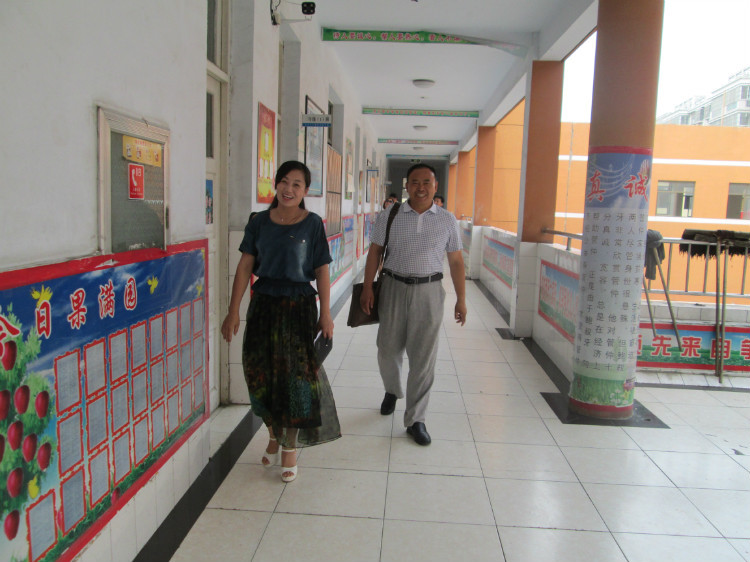 枣庄市现代学校基础部杨慧主任引导王校长参观学校教室文化和办公室文化。