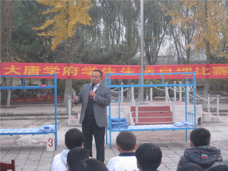 2015年11月9日,大唐学府在我校操场举行了全校学生生活自理比赛,学生们参赛热情高涨,现场气氛异常活跃!参赛学生都能认真对待比赛,一个个“豆腐块”就像被施展了魔法似的呈现在大家面前,这些可爱的孩子们,你们是最棒的!